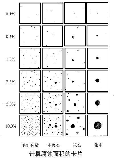 a)腐蝕缺陷面積超過(guò)除引線(xiàn)外的外殼鍍涂或底金屬面積的5%。在測(cè)量中要計(jì)入的腐蝕缺陷有;凹坑、氣泡、起皮和腐蝕生成物。腐蝕缺陷面積由以下方法確定:用已知缺陷面積的卡片或照片(見(jiàn)下圖)進(jìn)行比較,用網(wǎng)格或類(lèi)似的測(cè)量器具或鏡像分析儀直接測(cè)量。